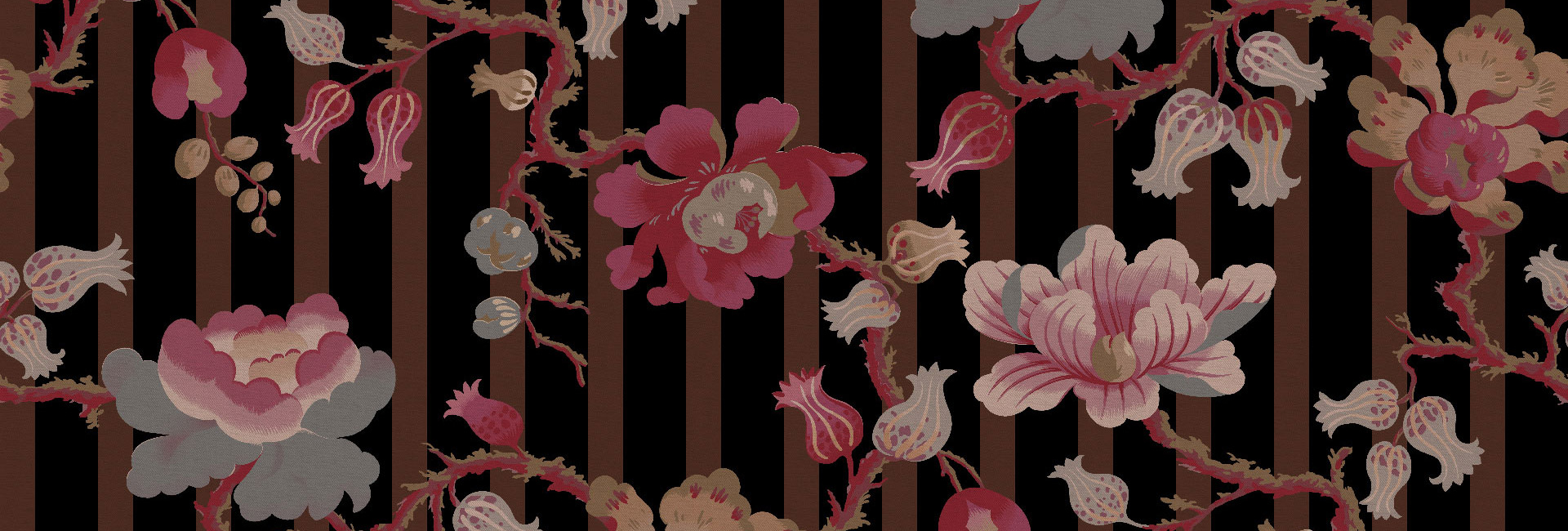 Dans la collection Tradition, le papier peint Colette occupe une place particulière en raison de son ambivalente esthétique quelle que soit sa version : des rayures aux subtiles contrastes colorés, Chocolat, Rose Orangé …. ou une opposition de motifs géométriques et végétaux, mêlant la fausse rigueur de la ligne droite à l’ondulation de fleurs imaginaires, sinueuses et dansantes faisant écho aux formes chères au style Art Déco.