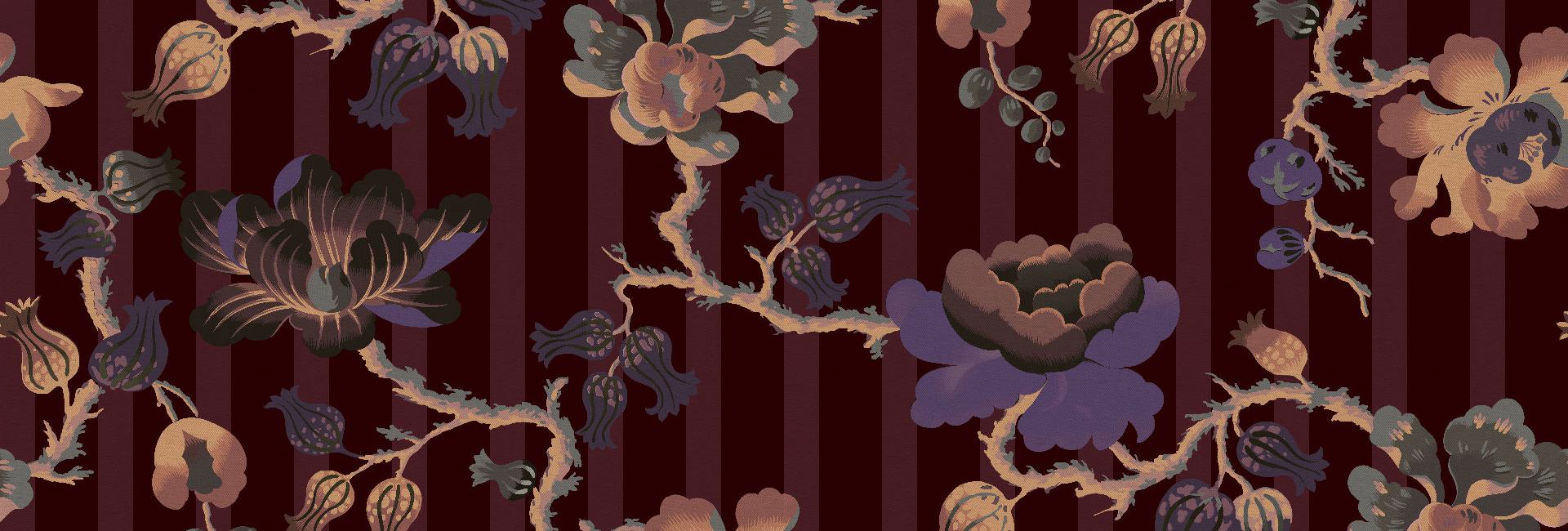 Dans la collection Tradition, le papier peint Colette occupe une place particulière en raison de son ambivalente esthétique quelle que soit sa version : des rayures aux subtiles contrastes colorés, Chocolat, Rose Orangé …. ou une opposition de motifs géométriques et végétaux, mêlant la fausse rigueur de la ligne droite à l’ondulation de fleurs imaginaires, sinueuses et dansantes faisant écho aux formes chères au style Art Déco.