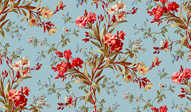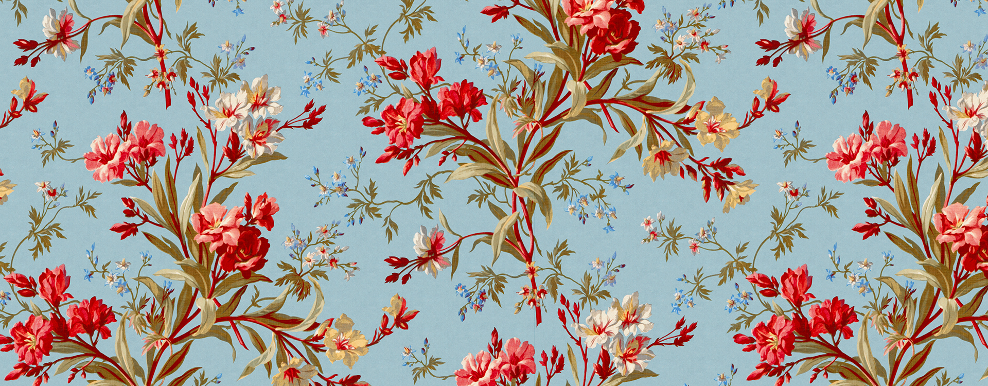 Pour habiller les murs, les papiers peints floraux s’inspirent largement du textile : compositions répétitives, arabesques végétales, bouquets stylisés ou rameaux grimpants. Ces décors muraux dialoguent étroitement avec les rideaux, tentures et tissus d’ameublement, contribuant à une harmonie décorative globale.